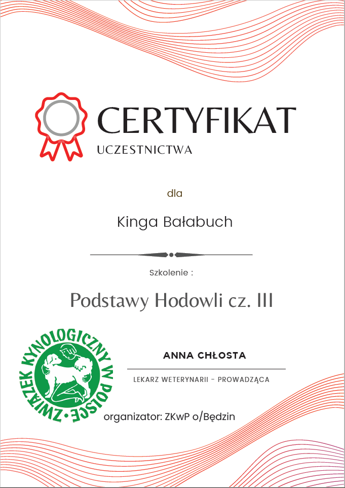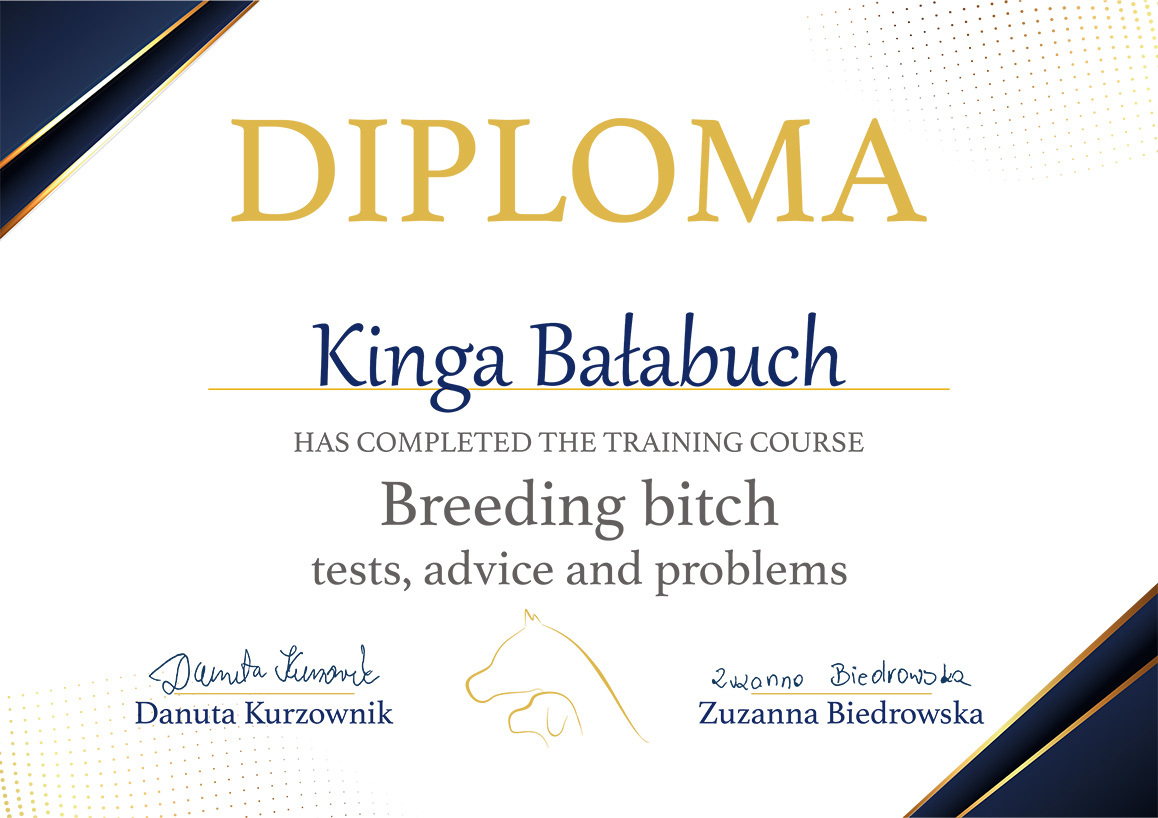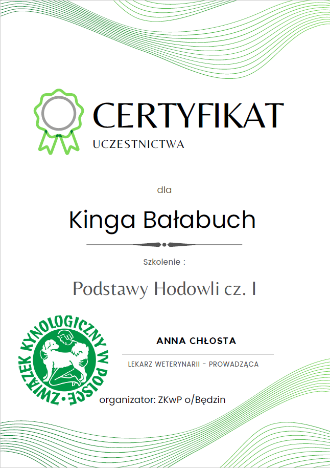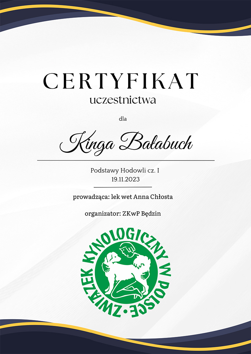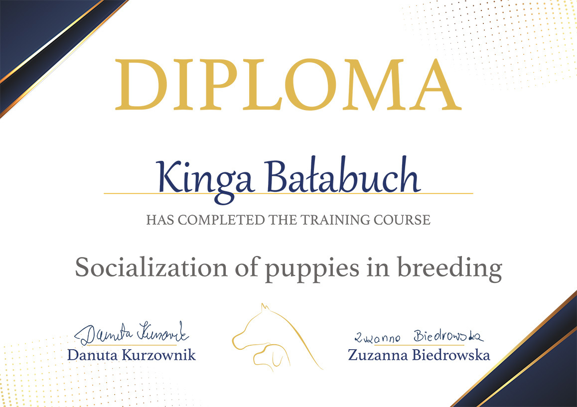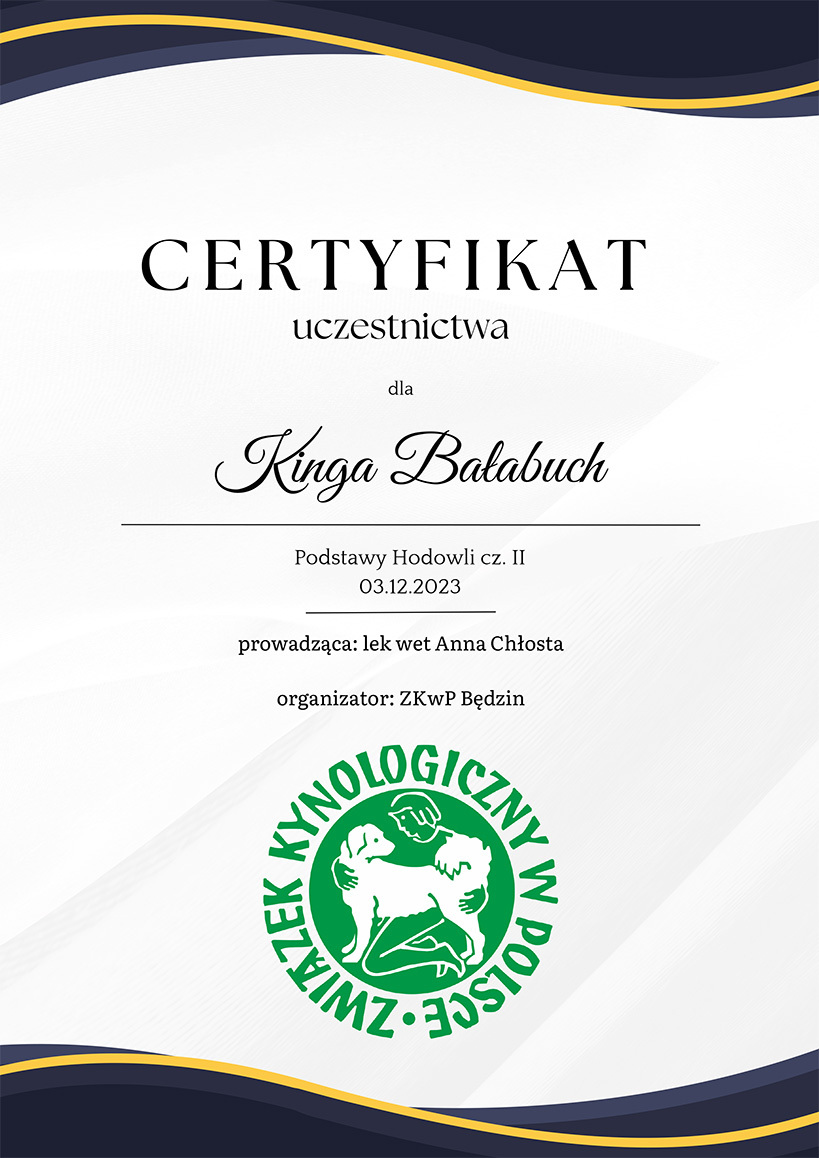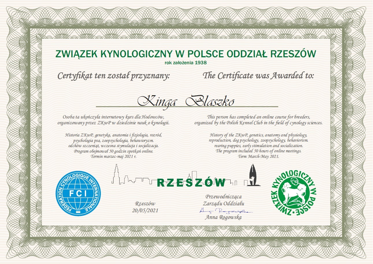 The most important stage was participating in 2021 in a course for breeders organized by the Rzeszów branch of ZKwP. The course lasted three months, included over 50 hours of learning, and covered topics such as the history of ZKwP, genetics, anatomy and physiology, reproduction, dog psychology, zoopsychology, behaviorism, puppy rearing, early stimulation, and socialization. The list of lecturers is extremely long: Anna Redlicka, Agnieszka Łyp-Chmielewska from Psiparagraf.pl, Anna Rogowska, Agnieszka Andrearczyk - Woźniakowska, Gizela Makarewicz, Jolanta Marcinkiewicz, Damian Kotela, Katarzyna Adamus-Fiszer, Katarzyna Bargiełowska, Marcin Lichnierowicz, Mirosław Redlicki, and Wojciech Kinda.