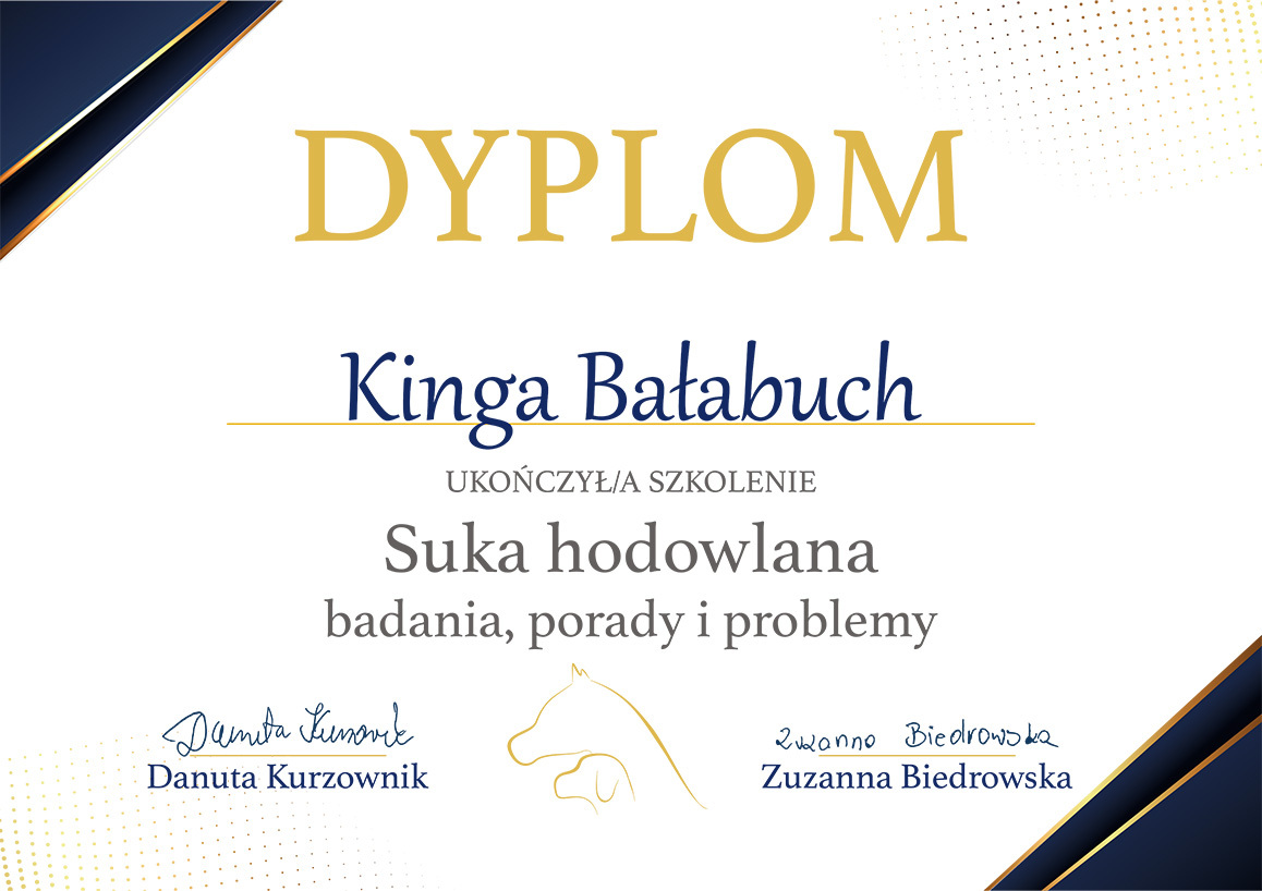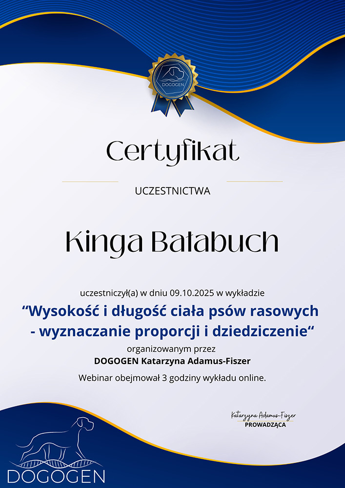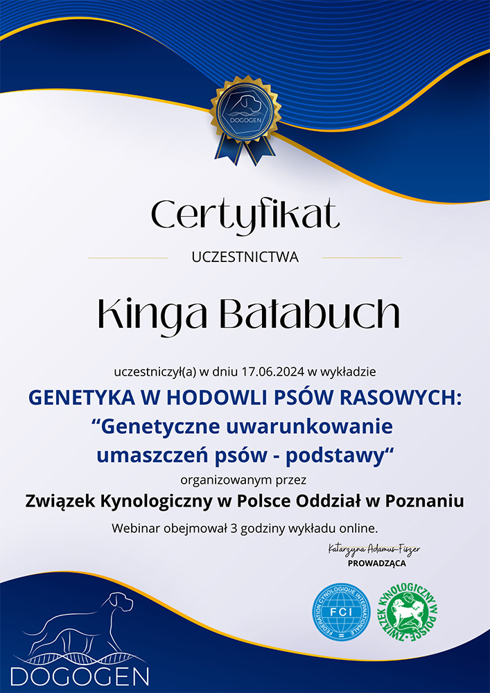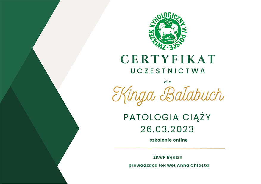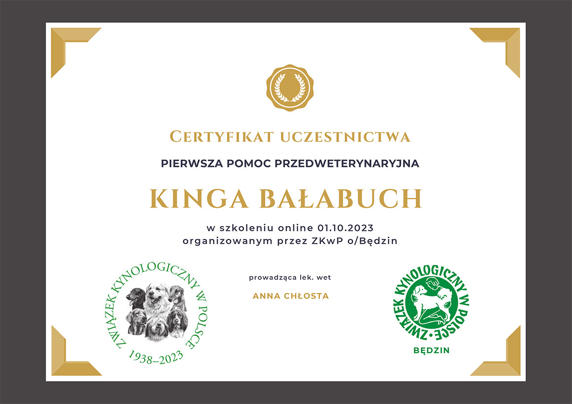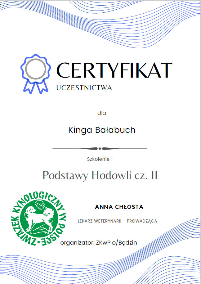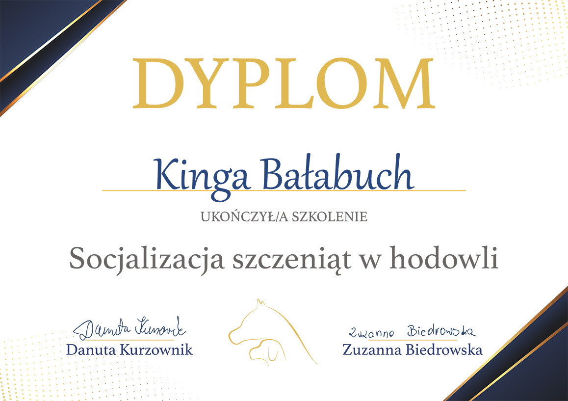 The most important stage was participating in 2021 in a course for breeders organized by the Rzeszów branch of ZKwP. The course lasted three months, included over 50 hours of learning, and covered topics such as the history of ZKwP, genetics, anatomy and physiology, reproduction, dog psychology, zoopsychology, behaviorism, puppy rearing, early stimulation, and socialization. The list of lecturers is extremely long: Anna Redlicka, Agnieszka Łyp-Chmielewska from Psiparagraf.pl, Anna Rogowska, Agnieszka Andrearczyk - Woźniakowska, Gizela Makarewicz, Jolanta Marcinkiewicz, Damian Kotela, Katarzyna Adamus-Fiszer, Katarzyna Bargiełowska, Marcin Lichnierowicz, Mirosław Redlicki, and Wojciech Kinda.