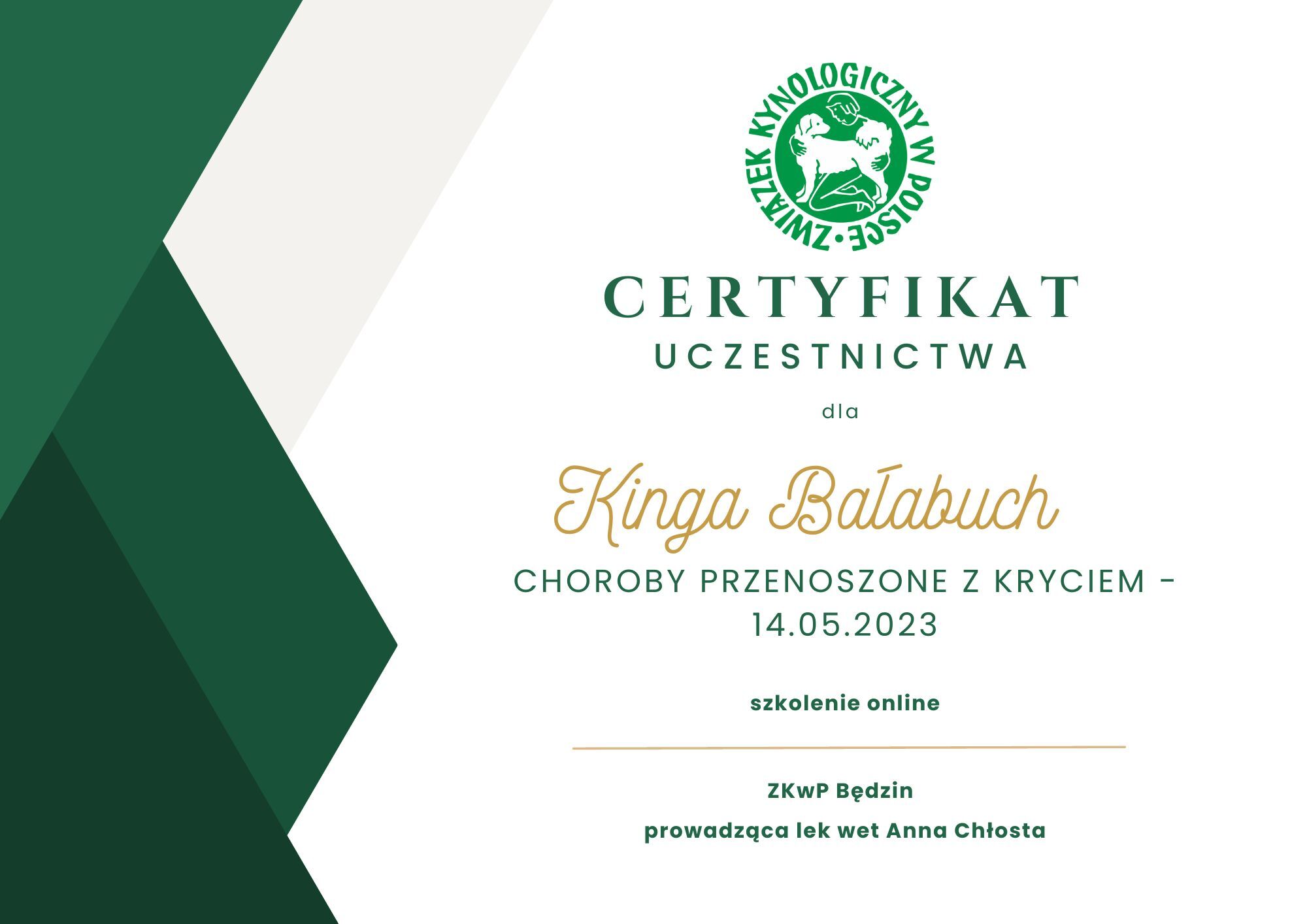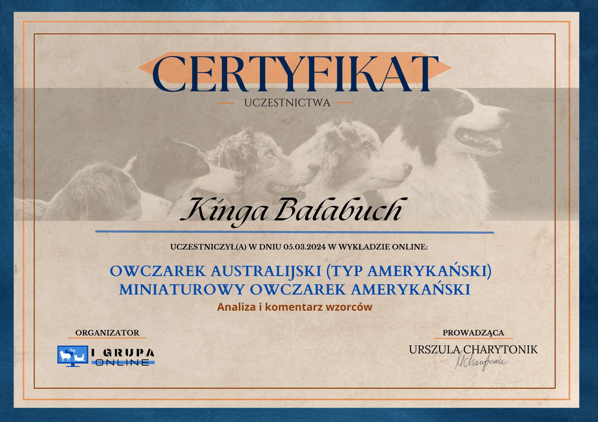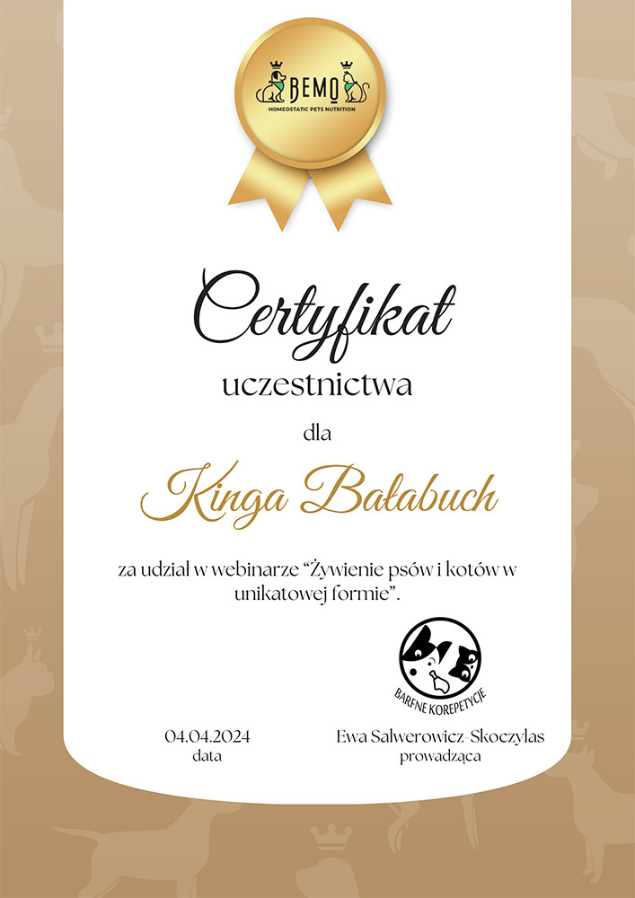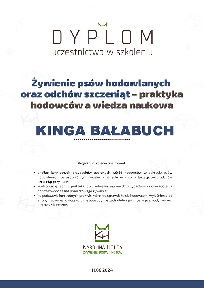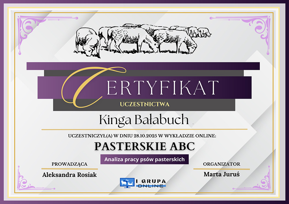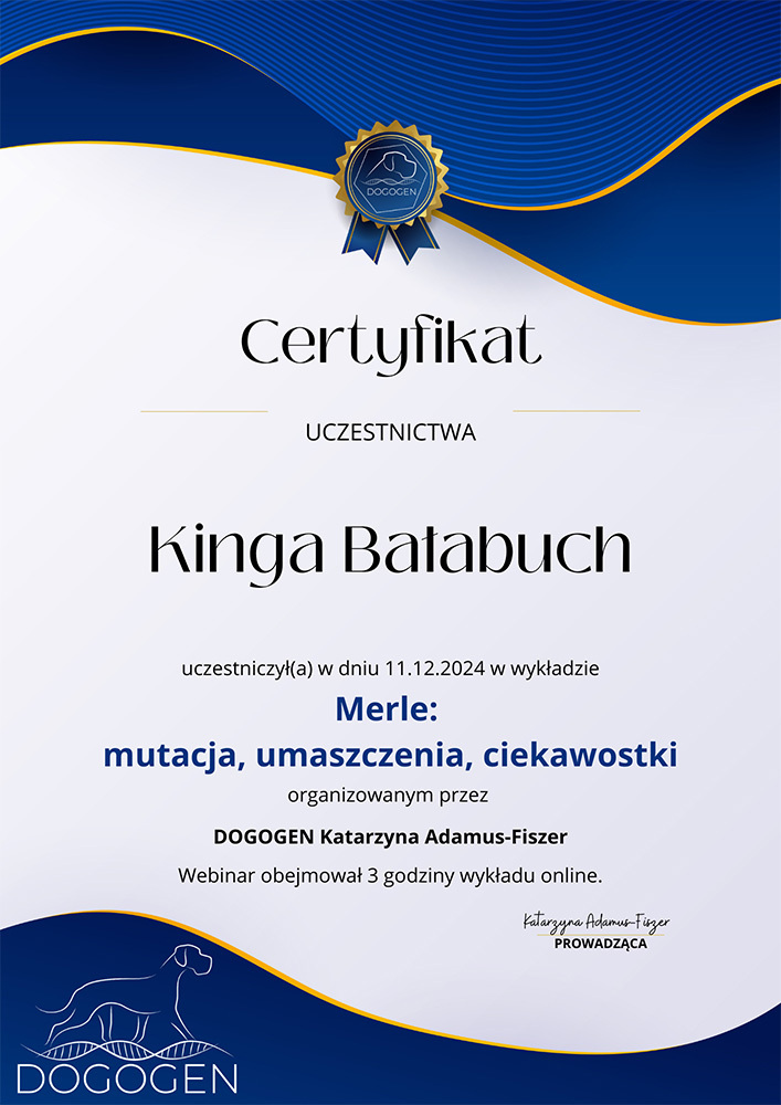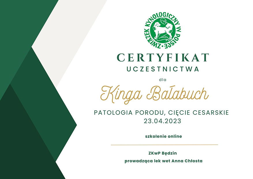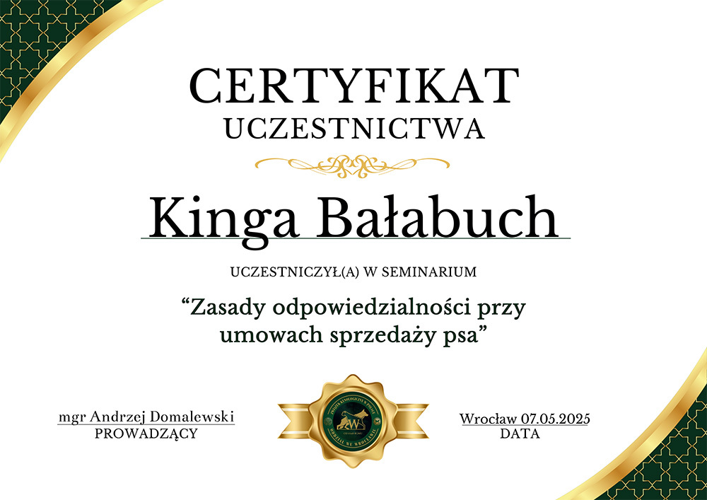 The most important stage was participating in 2021 in a course for breeders organized by the Rzeszów branch of ZKwP. The course lasted three months, included over 50 hours of learning, and covered topics such as the history of ZKwP, genetics, anatomy and physiology, reproduction, dog psychology, zoopsychology, behaviorism, puppy rearing, early stimulation, and socialization. The list of lecturers is extremely long: Anna Redlicka, Agnieszka Łyp-Chmielewska from Psiparagraf.pl, Anna Rogowska, Agnieszka Andrearczyk - Woźniakowska, Gizela Makarewicz, Jolanta Marcinkiewicz, Damian Kotela, Katarzyna Adamus-Fiszer, Katarzyna Bargiełowska, Marcin Lichnierowicz, Mirosław Redlicki, and Wojciech Kinda.