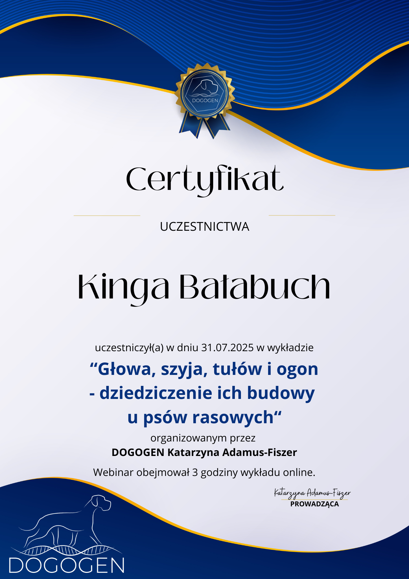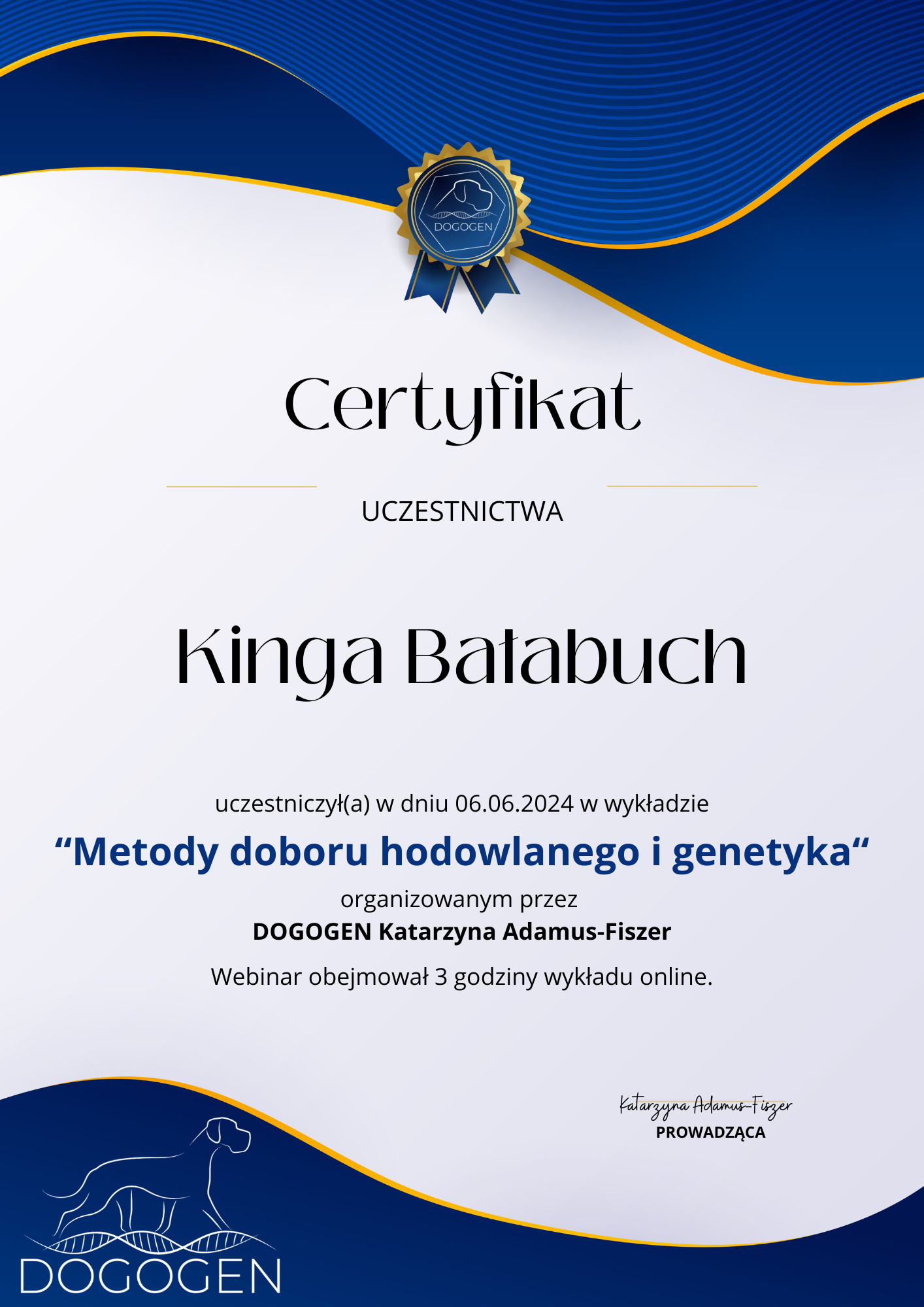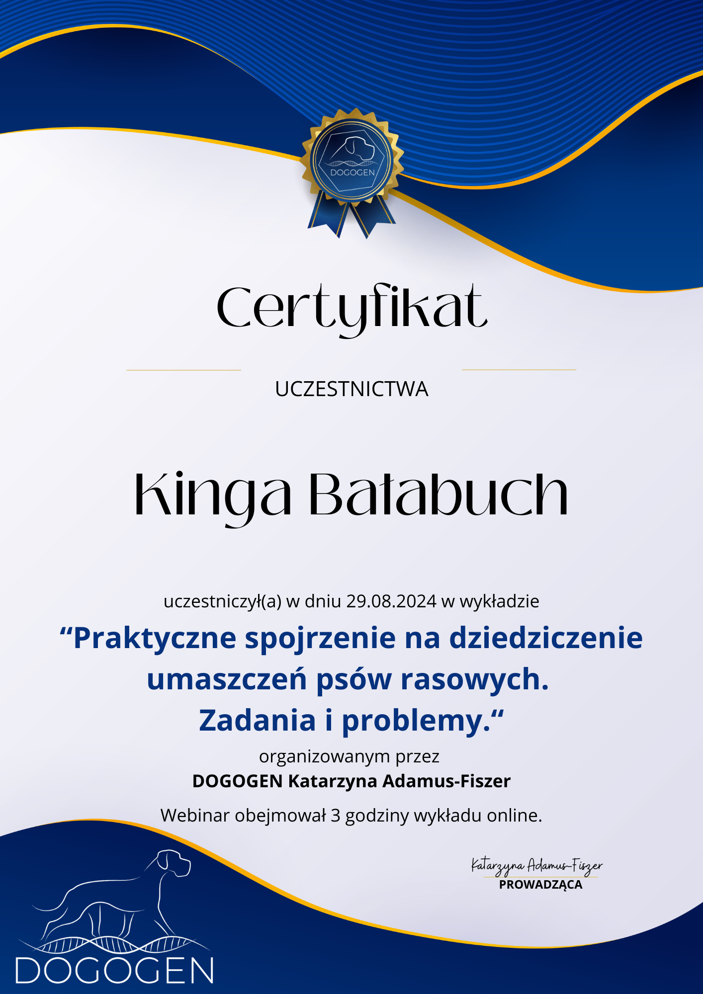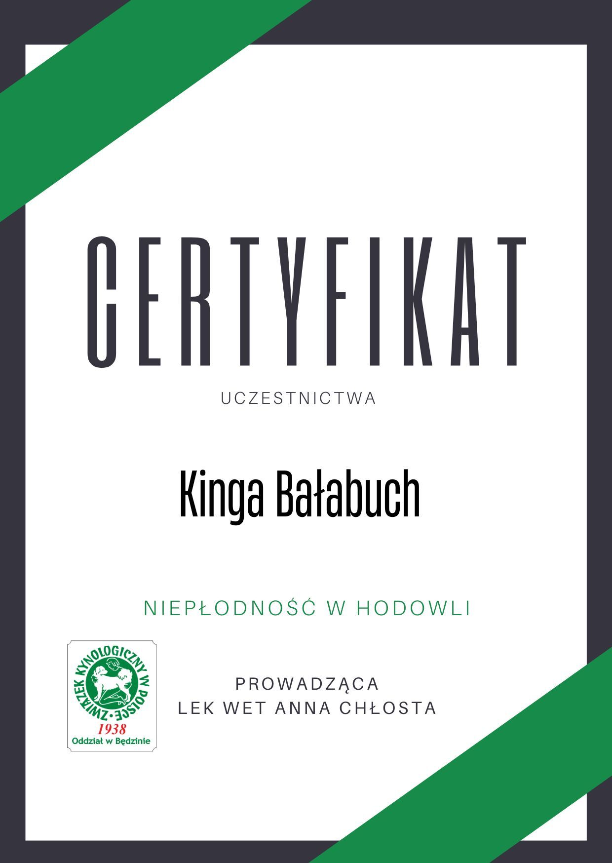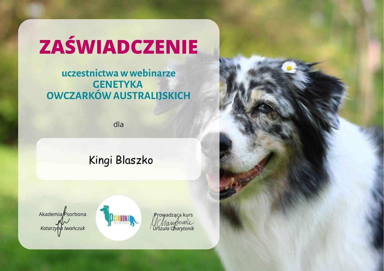 The most important stage was participating in 2021 in a course for breeders organized by the Rzeszów branch of ZKwP. The course lasted three months, included over 50 hours of learning, and covered topics such as the history of ZKwP, genetics, anatomy and physiology, reproduction, dog psychology, zoopsychology, behaviorism, puppy rearing, early stimulation, and socialization. The list of lecturers is extremely long: Anna Redlicka, Agnieszka Łyp-Chmielewska from Psiparagraf.pl, Anna Rogowska, Agnieszka Andrearczyk - Woźniakowska, Gizela Makarewicz, Jolanta Marcinkiewicz, Damian Kotela, Katarzyna Adamus-Fiszer, Katarzyna Bargiełowska, Marcin Lichnierowicz, Mirosław Redlicki, and Wojciech Kinda.