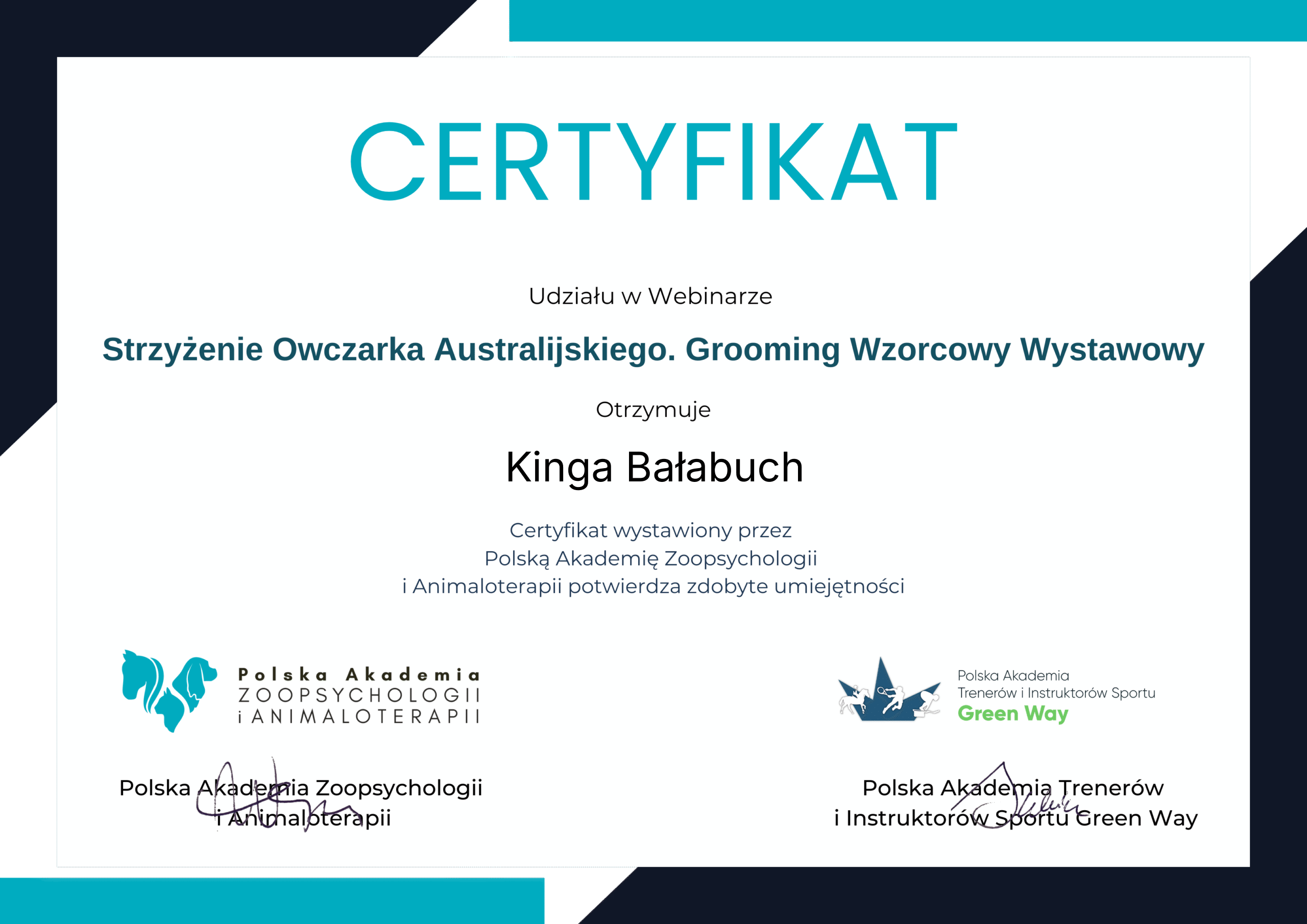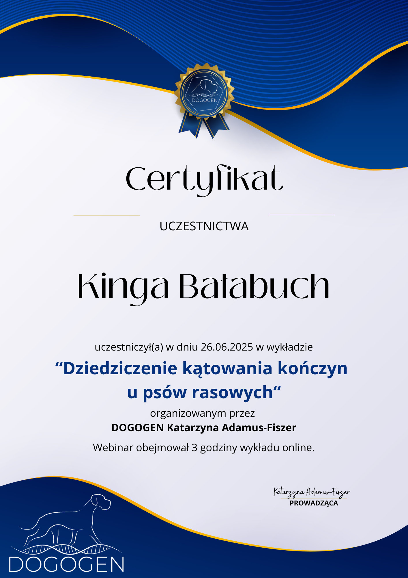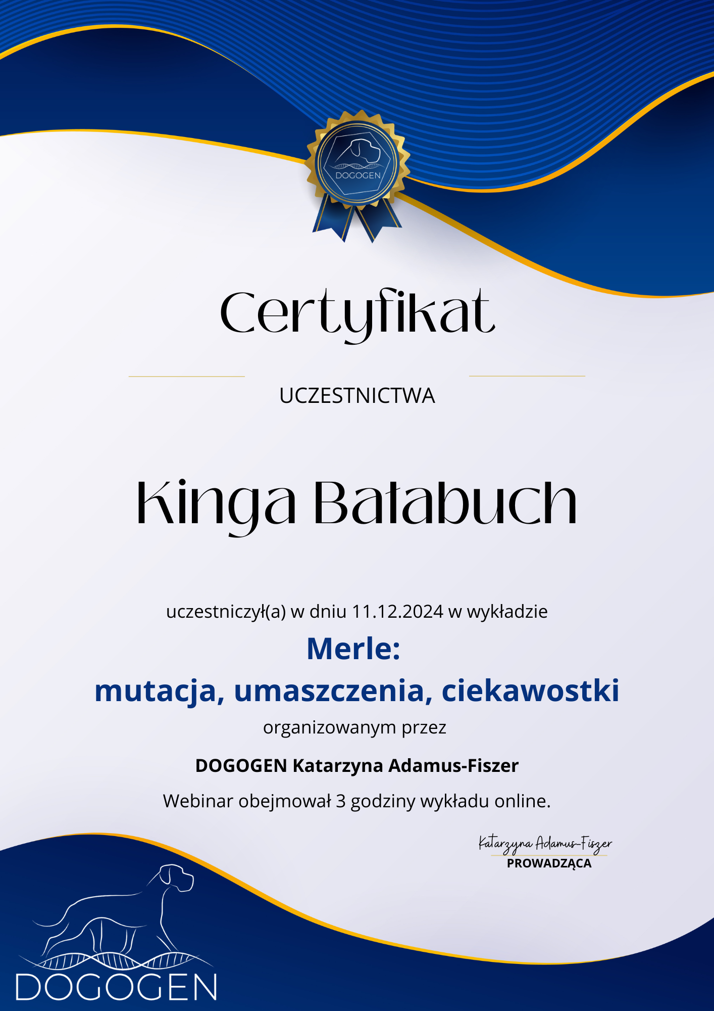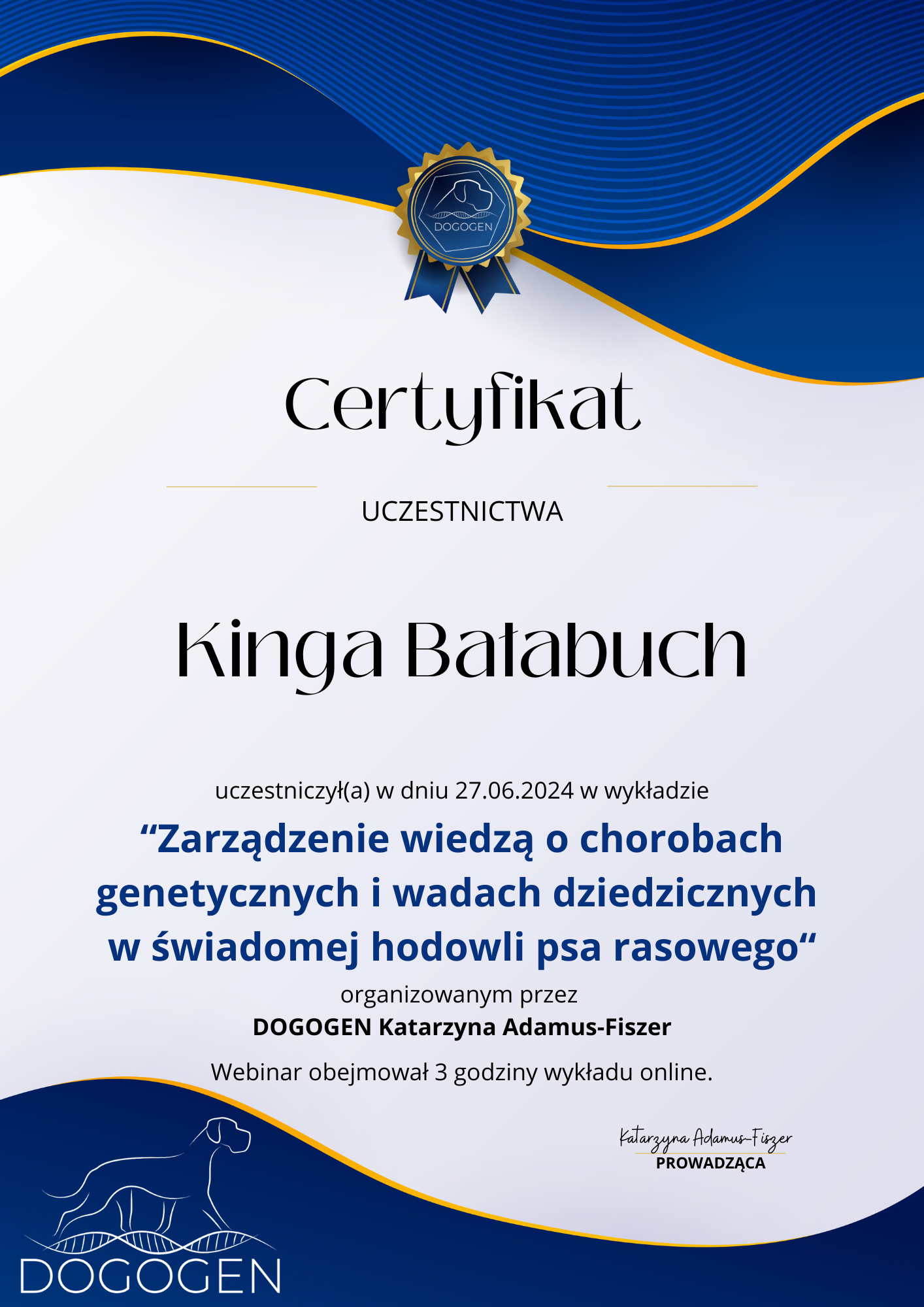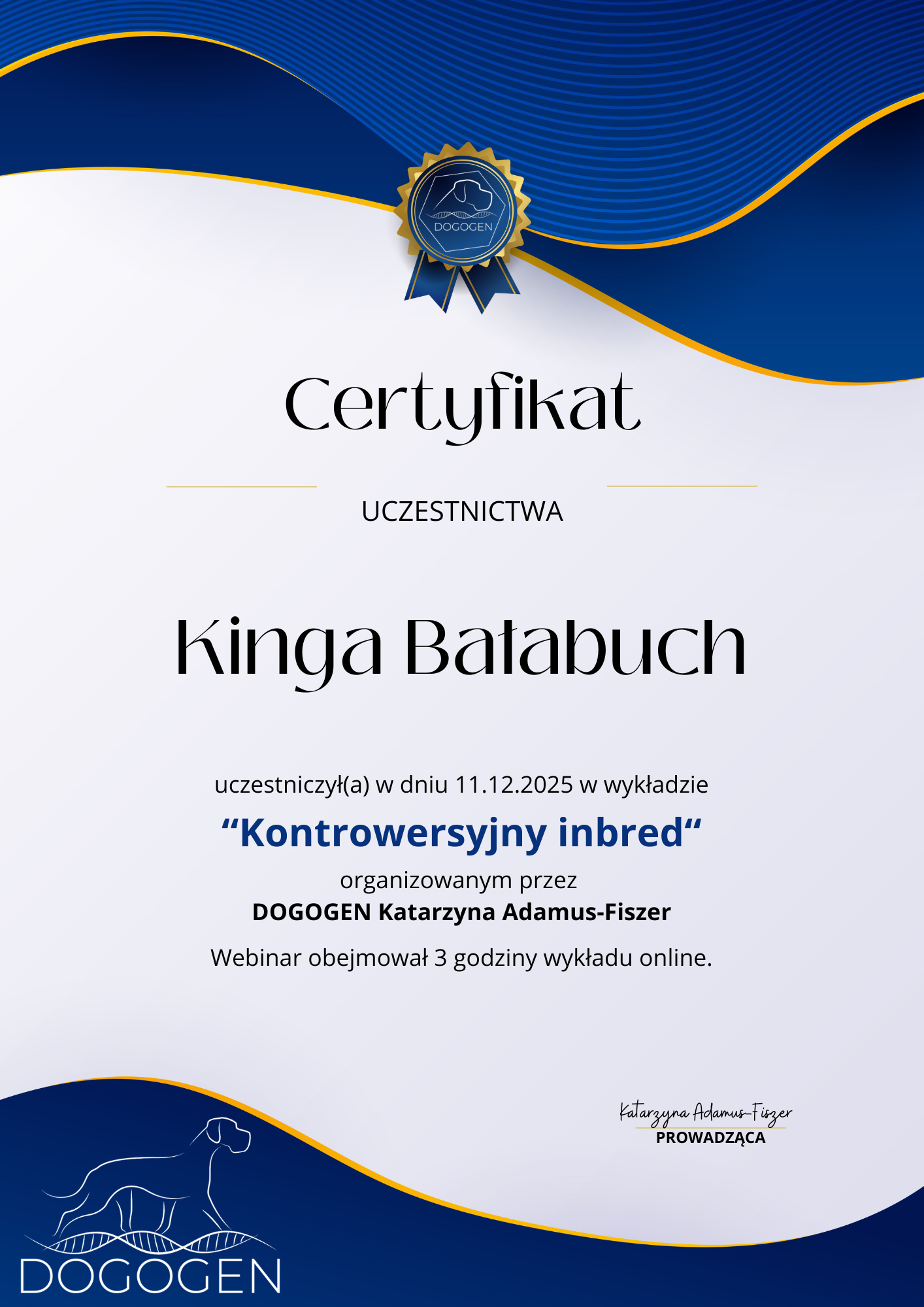 The most important stage was participating in 2021 in a course for breeders organized by the Rzeszów branch of ZKwP. The course lasted three months, included over 50 hours of learning, and covered topics such as the history of ZKwP, genetics, anatomy and physiology, reproduction, dog psychology, zoopsychology, behaviorism, puppy rearing, early stimulation, and socialization. The list of lecturers is extremely long: Anna Redlicka, Agnieszka Łyp-Chmielewska from Psiparagraf.pl, Anna Rogowska, Agnieszka Andrearczyk - Woźniakowska, Gizela Makarewicz, Jolanta Marcinkiewicz, Damian Kotela, Katarzyna Adamus-Fiszer, Katarzyna Bargiełowska, Marcin Lichnierowicz, Mirosław Redlicki, and Wojciech Kinda.