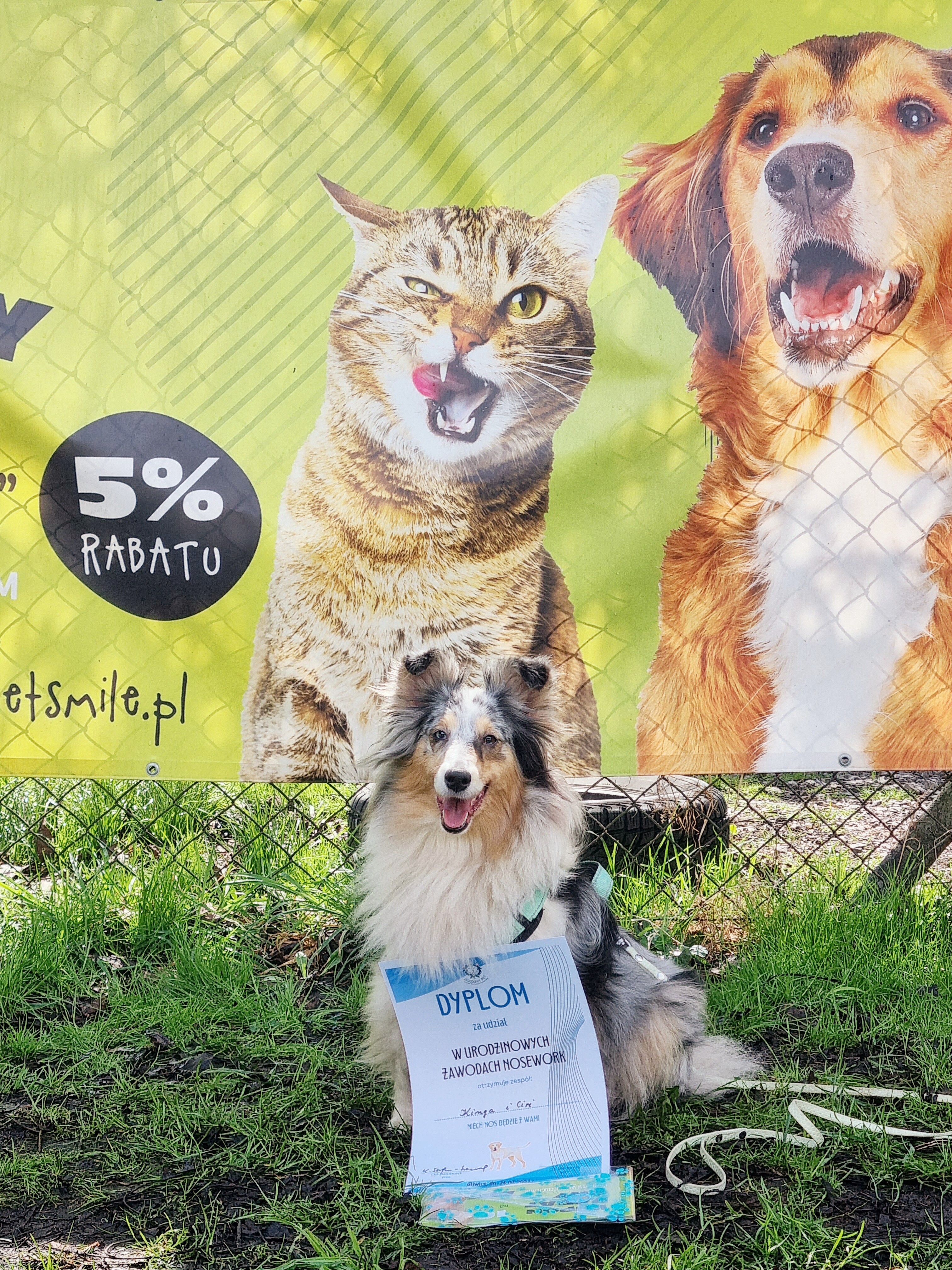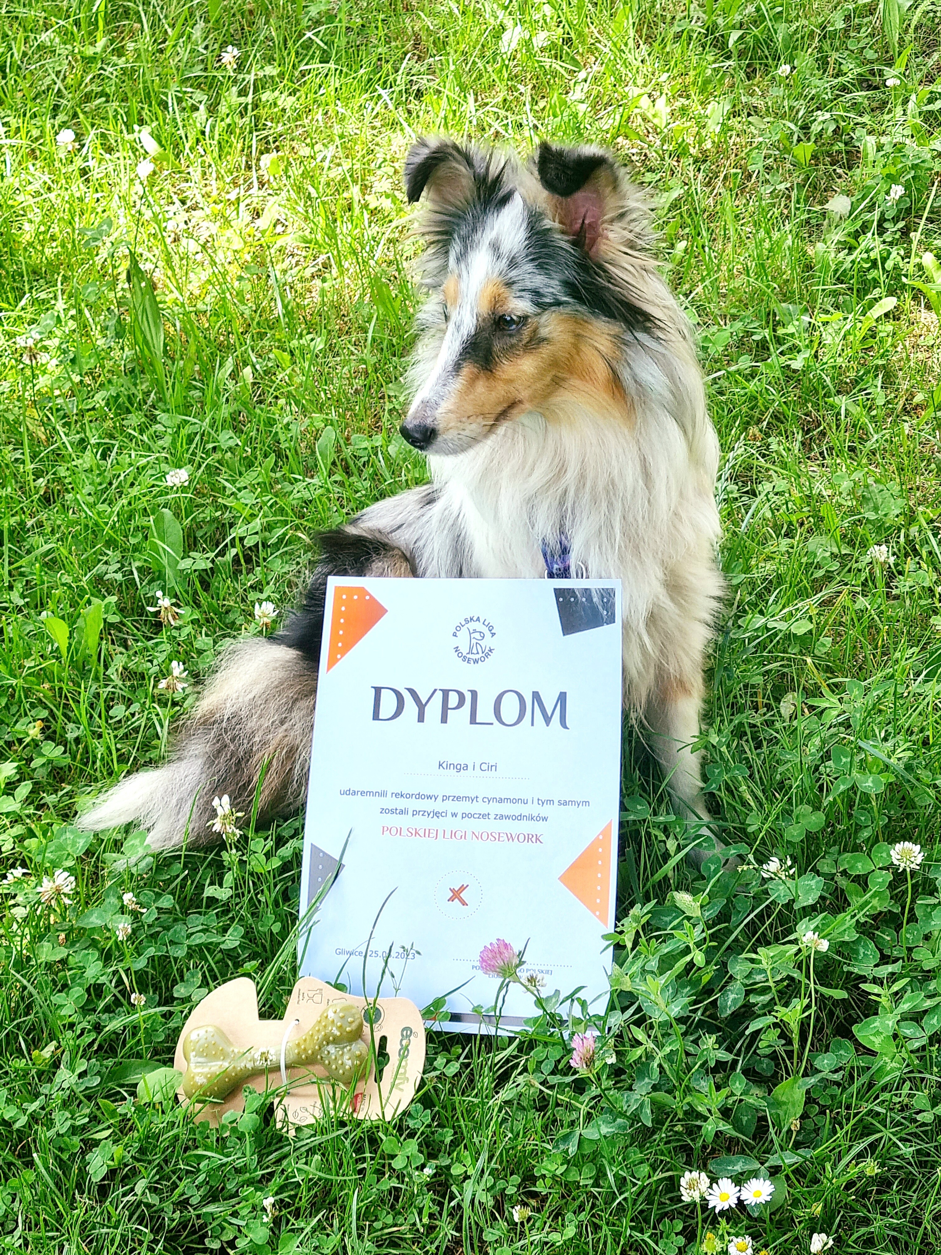 Ciri has passed exams for all 3 scents: cinnamon, orange peel and clove in three leagues: Polish Nosework League and the Polish Academy of Zoopsychology and Animal Therapy (PAZiA) and Nosework Poland.